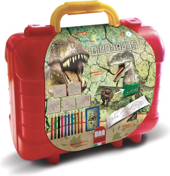 Dit koffertje bevat een schat aan kleur- en stempelmateriaal. Tien kleurpotloden, vijf Dinosaurs-stempels en een vel met maar liefst 64 stickers geven je alle ruimte om jouw creativiteit de vrije loop te laten. En als je klaar bent, berg je alles weer op in het handige draagkoffertje!