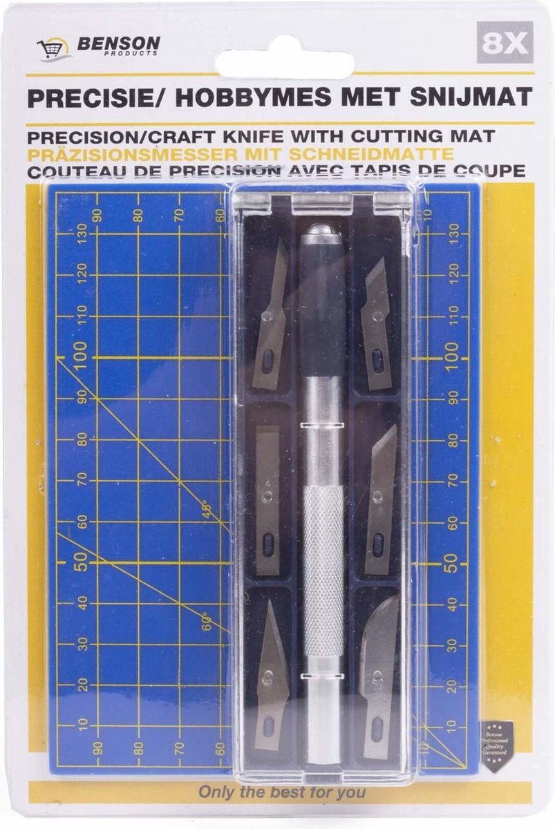 Deze professionele hobby messenset is ideaal voor de modelbouwer en hobbyist. De complete 8-delige set wordt geleverd in een mooi opbergdoosje zodat je de onderdelen netjes op orde en altijd direct bij de hand hebt. Nauwkeurig en fijn snijwerk is met de set uitstekend uit te voeren. Dit hobbymes is met een blauwe snijmat.
